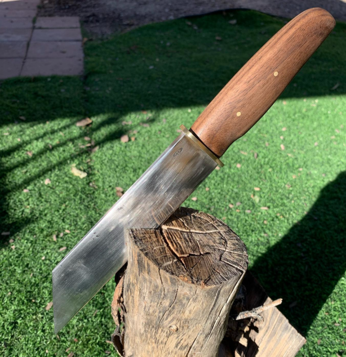 the day before my birthday, I went for it. I took a small piece of an old leaf spring and forged out a Viking seax styled knife. With a piece of walnut from the hardware store and a small piece of brass for the guard, I completed my first ever real knife – thrilled to see it take shape. It took me a few days to really get things sanded, cleaned up and ready for heat treat, since I was working with very basic tools at that time. It wasn’t the prettiest thing to look at, but that was kind of the point. It was supposed to look rugged and kind of beat up, since it’s intent was to be used.